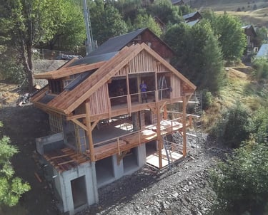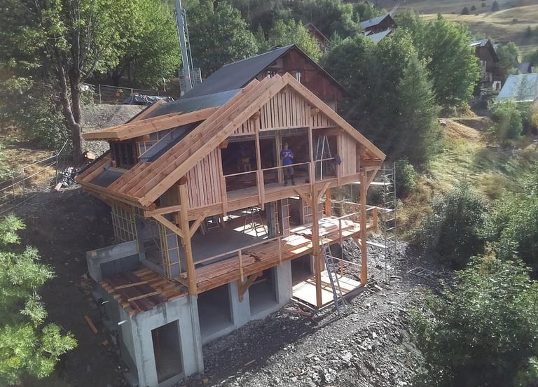 Réalisation de maisons à ossature bois, charpentes et structures durables associant performance thermique et élégance naturelle.